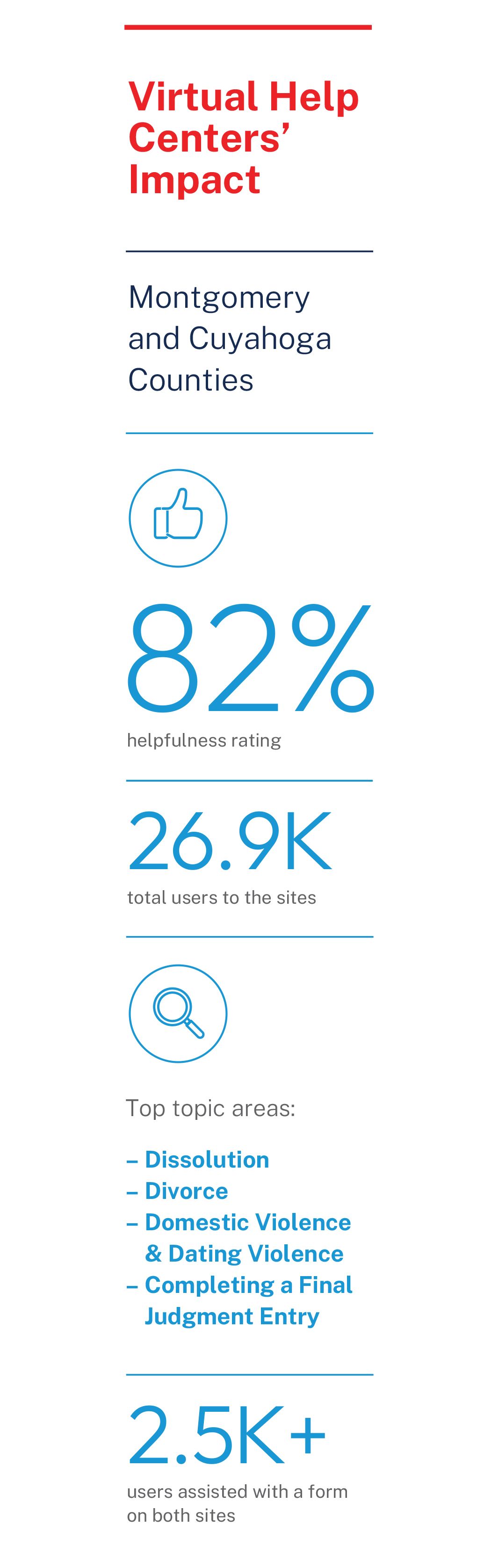 Technology continues to enhance access to legal help, and in 2024, we expanded our Virtual Self-Help Centers (VSHCs) to better serve Ohio communities. Building on the success of the first VSHC in Montgomery County, we partnered with the Cuyahoga County Domestic Relations Court to launch a new VSHC for self-represented litigants.