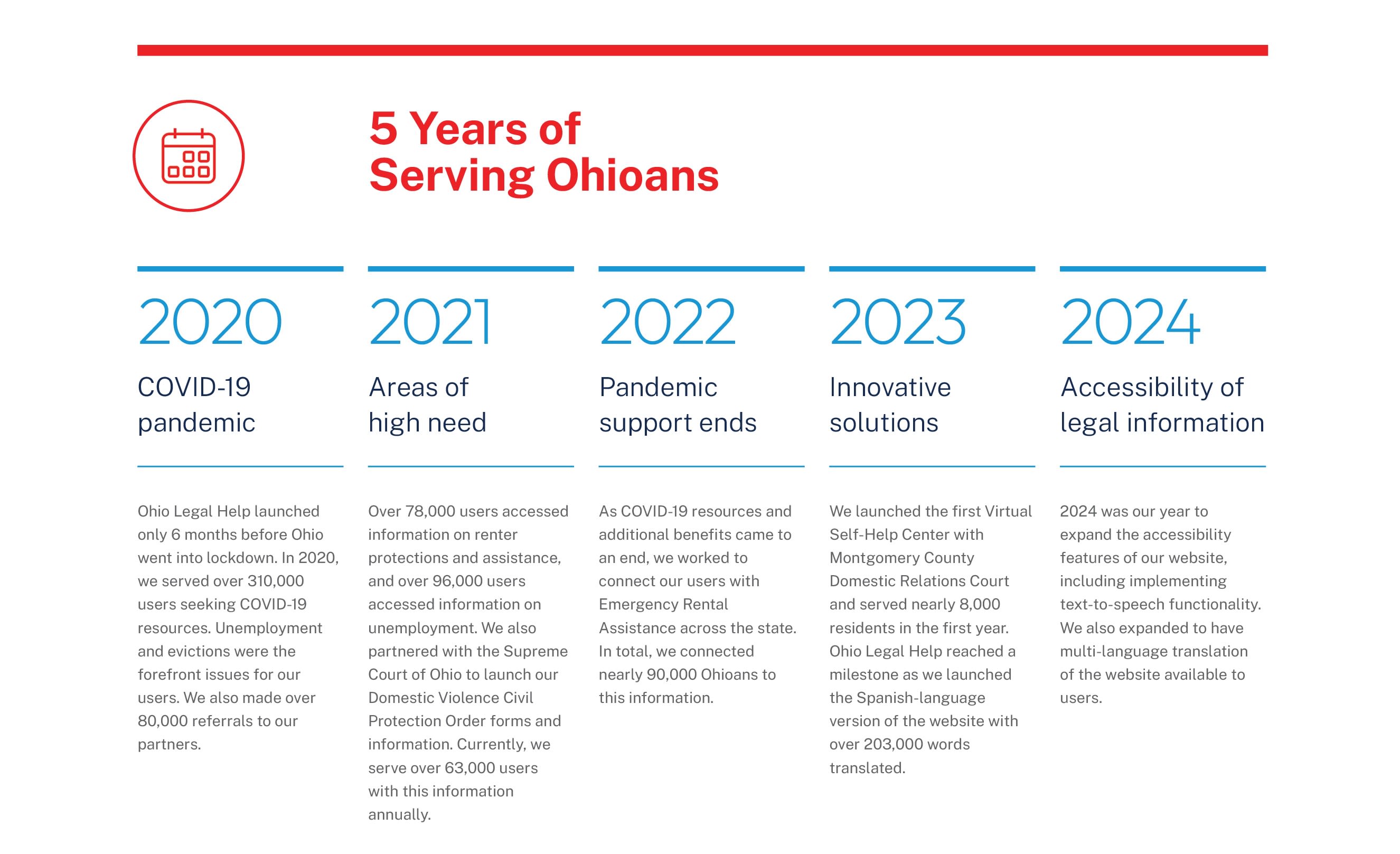 Since launching in 2019, Ohio Legal Help has transformed the way Ohioans access legal information and resources. What started as an initiative to bridge the justice gap has grown into a vital tool serving over 3.7 million users and counting. Over the past five years, we have empowered individuals and families by providing clear, actionable legal guidance when they need it most.