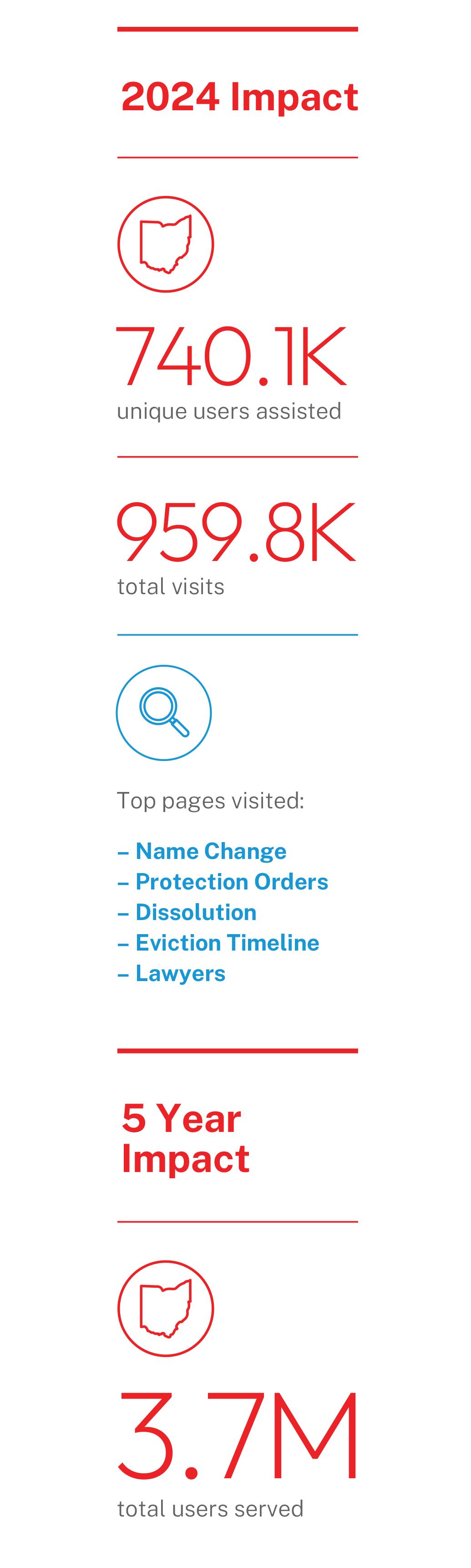Just six months after our launch, the COVID-19 pandemic upended daily life, and Ohioans turned to us in record numbers. In 2020 alone, more than 310,000 people visited our site, seeking information on unemployment benefits, eviction protections, and other resources. Over the years, we’ve adapted to meet evolving needs—from launching Domestic Violence Civil Protection Order forms in 2021 to helping nearly 90,000 Ohioans access rental assistance in 2022.